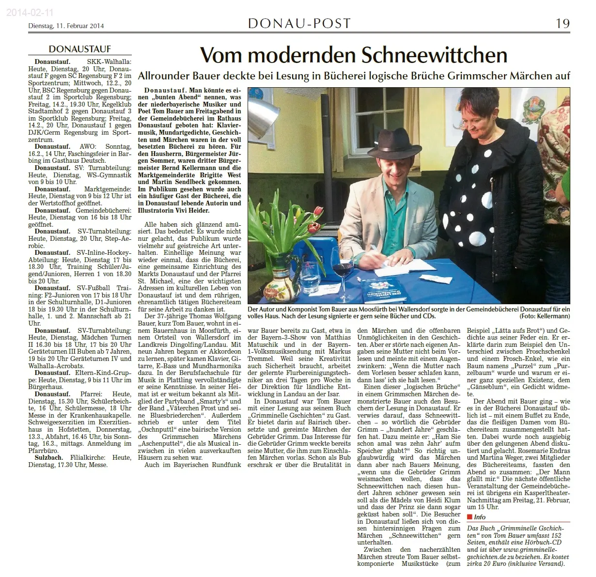 Einen kurzweiligen Abend bescherte Tom Bauer seinen Zuhörern am 7. Februar in der Gemeindebücherei Donaustauf. Er las aus seinem Buch "Grimminelle Gschichten" und gab zusätzlich auf äußerst unterhaltsame Art und Weise eigene Gedichte und Musikstücke am E-Klavier zum Besten.